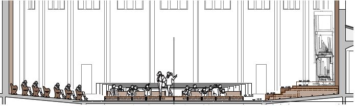 ■ Werden für einzelne Veranstaltungen eine kleinere Bühne und mehr Zuhörer-Plätze verwendet, können die Bühnenelemente für den Chor-/Orchester-Aufbau verwendet werden. Die bestehenden Heizungsrohre werden dann mit Stühlen überbaut.