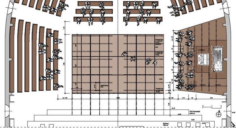 ■ Die bestehenden vorderen acht Bankreihen werden ausgebaut und gelagert. Die bestehenden Heizungsrohre bleiben unangetastet.